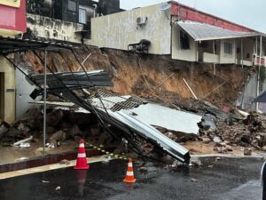A capital amazonense recebeu uma forte chuva na tarde desta terça-feira (4), que transformou ruas em “rios” e causou o desabamento de um muro, derrubando uma cobertura e deixando duas pessoas feridas, na rua Ajuricaba, localizada entre a avenida Visconde de Porto Alegre e a rua Jonathas Pedrosa, no Centro, zona Sul de Manaus. O Instituto Nacional de Meteorologia (Inmet) já havia anunciado previsão de chuva intensa.