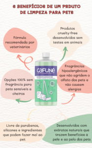 Ou, para facilitar, você pode investir em linhas especiais de produtos de limpeza para pets, como a Cafuné. Assim, você pode escolher desinfetantes e limpadores sem receio.