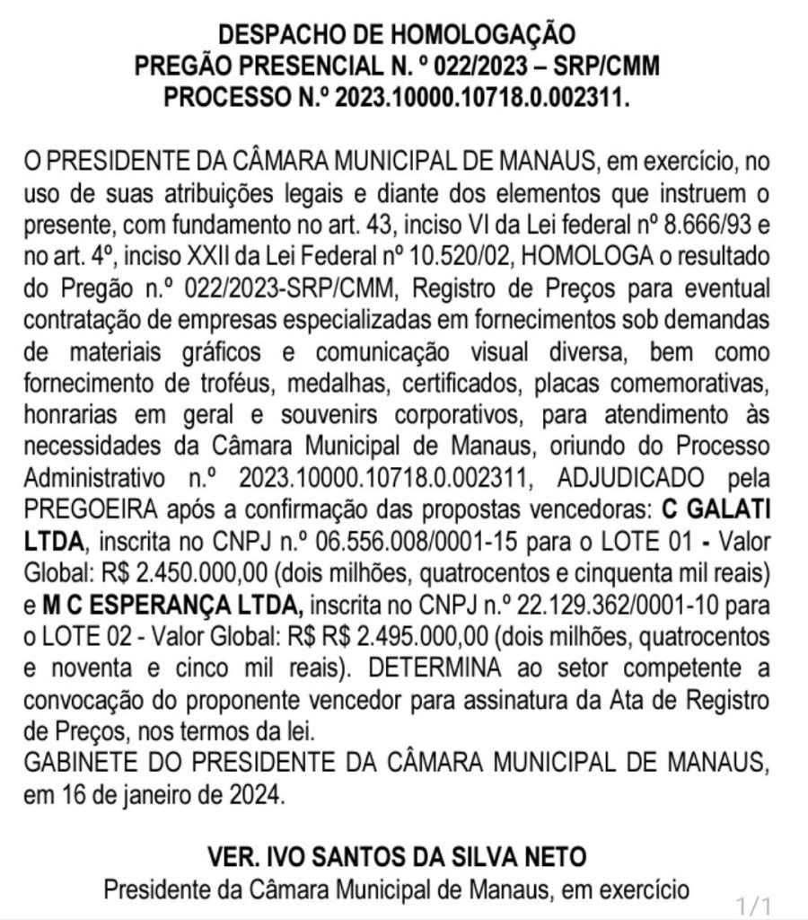 O documento foi assinado no dia 16 de janeiro pelo presidente em exercício da Câmara, o vereador Ivo Neto (PMB), que substituiu o presidente Caio André (Patriota), e publicado no Diário Oficial da Casa, garantindo o pagamento de R$ 4.945.000,00 (quatro milhões e novecentos e quarenta e cinco mil reais) para as empresas C GALATI LTDA que irá receber R$ 2.450.000,00 (dois milhões, quatrocentos e cinquenta mil reais) e a M C ESPERANÇA LTDA que vai receber R$ 2.495.000,00 (dois milhões, quatrocentos e noventa e cinco mil reais).