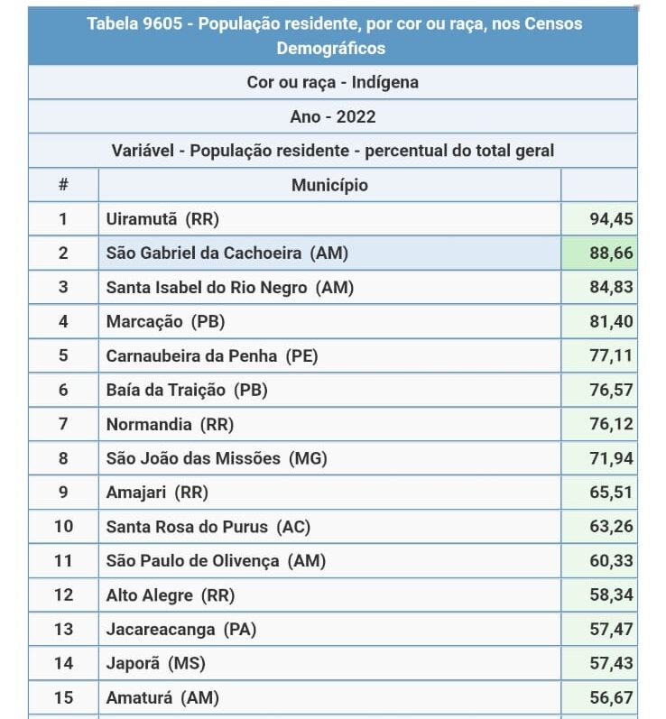 Conforme dados do IBGE, São Gabriel é o segundo município com maior percentual de indígenas. Manaus é o município e a capital com maior número de pessoas indígenas, segundo explicou o supervisor estadual de Disseminação de Informações do Instituto, Adjalma Nogueira Jaques.