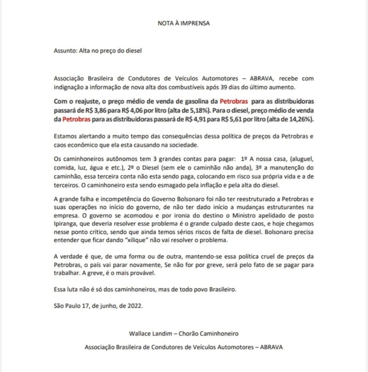 “A verdade é que, de uma forma ou de outra, mantendo-se essa política cruel de preços da Petrobras, o país vai parar novamente. Se não for por greve, será pelo fato de se pagar para trabalhar. A greve é o mais provável”, declara o documento assinado por Wallace Landim, o ‘Chorão’, presidente da Associação Brasileira de Condutores de Veículos Automotores (Abrava).