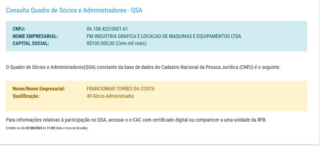 A empresa, segundo dados da Receita Federal, foi fundada no dia 23 de outubro de 2023, com situação cadastral ativa desde o dia 3 de novembro de 2011.