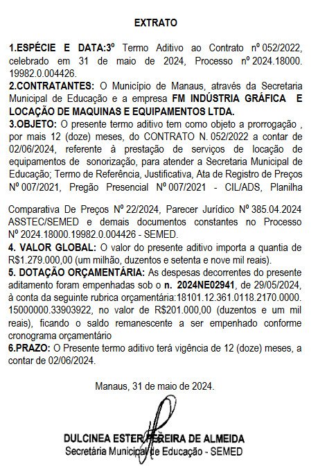 O 1º Termo de Aditivo foi assinado por Dulcinea Almeida e publicado no Diário Oficial do Município (DOM) no dia 29 de maio de 2024. Conforme o documento, a renovação de contrato terá vigência de 12 meses, a contar do dia 12 de maio.