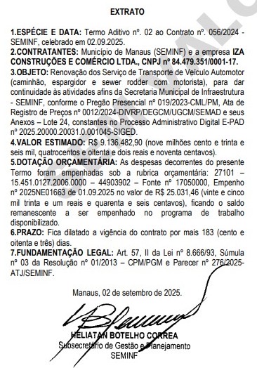 A IZA Construções, inclusive, aparece em novo documento oficial datado de 2 de setembro de 2025, no qual a Seminf formaliza a renovação do contrato nº 056/2024, com valor estimado de R$ 9.136.482,90 para serviços de transporte de veículo automotor e apoio operacional às atividades da pasta. O termo aditivo estende a vigência por mais 180 dias.