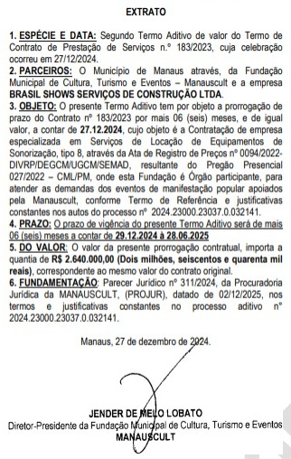 O valor das renovações que possuem prazo de apenas seis meses, realizadas durante o mês de janeiro de 2025, já está quase atingindo o valor destinado à Manauscult por meio da Lei Orçamentária Anual (LDO). Em consulta feita pelo Dia a Dia Notícia ao Portal da Transparência, da prefeitura de Manaus, consta que a pasta municipal de Cultura tem à disposição o valor de R$ 110.409.000,00.