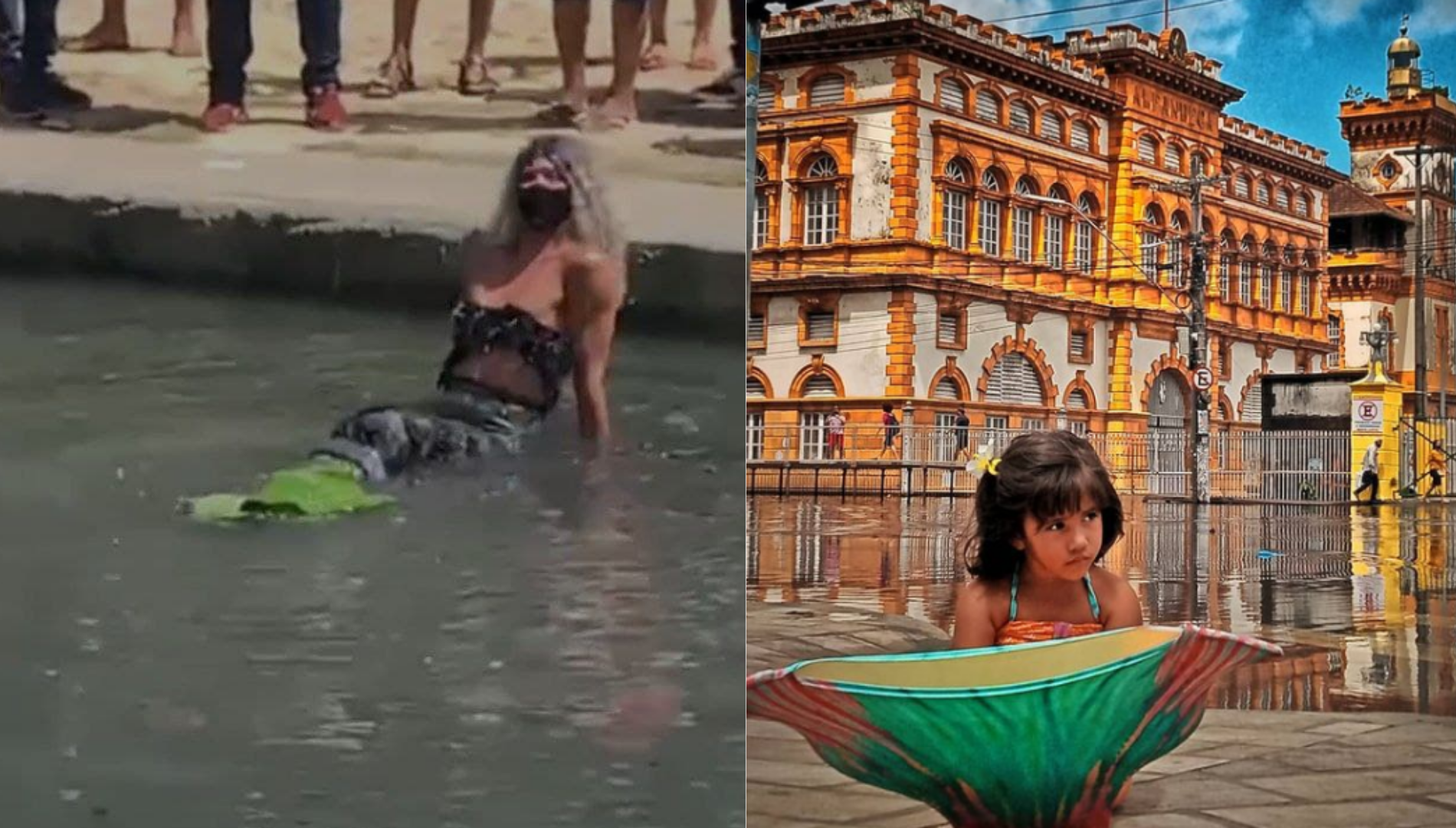 Aproveitando a movimentação de pessoas na avenida Eduardo Ribeiro, próximo ao Relógio Municipal, Pabllo Lima rapidamente alcançou popularidade nas redes sociais ao viralizar “mergulhando” na rua alagada com sua fantasia de sereia.