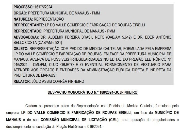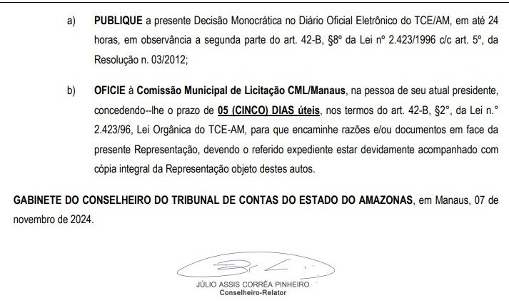 O Tribunal de Contas do Amazonas (TCE-AM) determinou que a Comissão Municipal de Licitação, da prefeitura de Manaus, no prazo de cinco dias úteis, encaminhe documentos referentes à representação com medida cautelar para apuração de irregularidades e descumprimento no Pregão Eletrônico nº 016/2024. A informação consta no Diário Oficial Eletrônico do TCE-AM da quinta-feira (7).