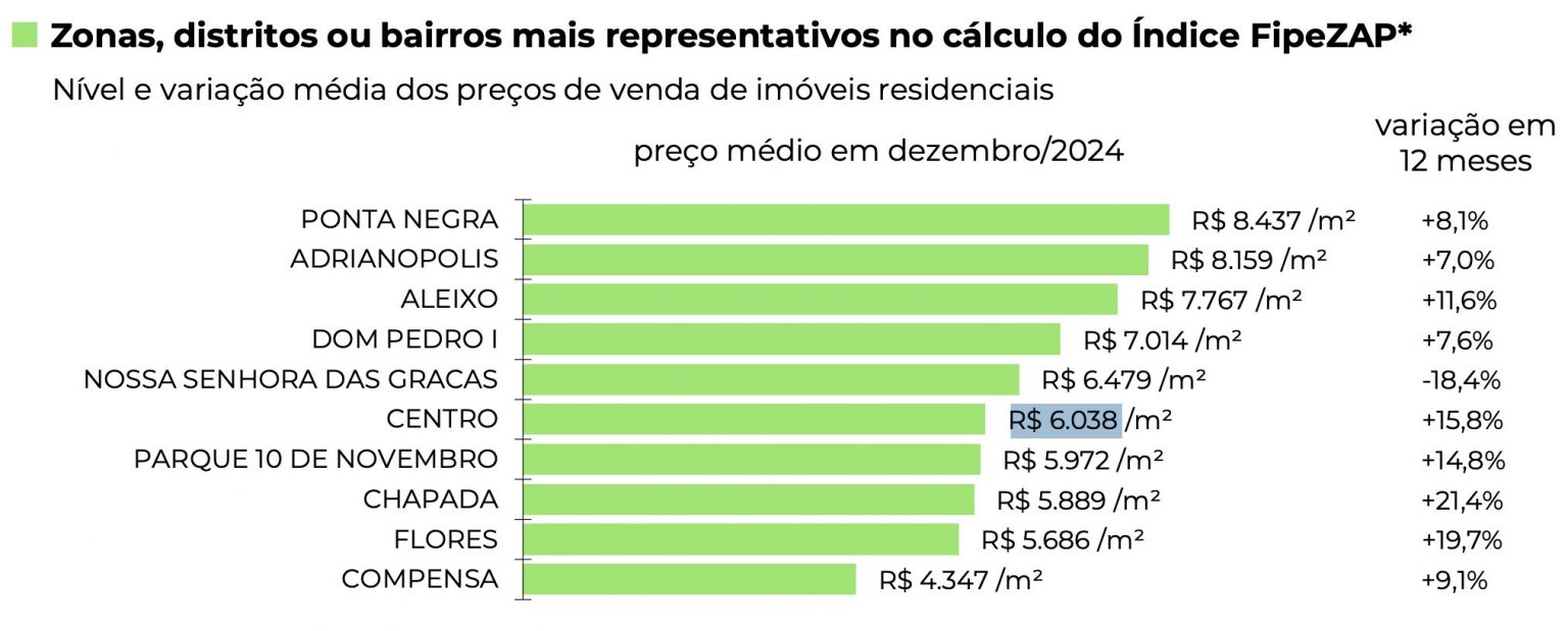 O bairro da Compensa, na zona Oeste de Manaus, liderou a valorização dos preços de imóveis residenciais em 2025, segundo dados do Índice FipeZap. No sentido oposto, a Ponta Negra, bairro de alto padrão localizado na mesma região da cidade, registrou a segunda maior queda no valor dos imóveis, com retração de 4,3%, ficando atrás apenas do Centro, que apresentou redução de 9,4%.