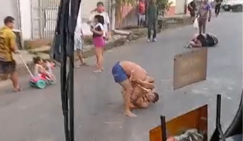 Por outro lado, também estava rolando uma briga entre dois homens, um que estava sem camisa e o outro com camisa de time de futebol.