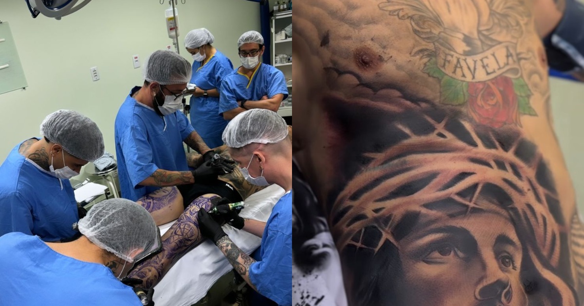 MC Cabelinho também revelou que tomou uma anestesia geral em uma das tatuagens. “Contratei uma equipe médica, fechei uma sala de cirurgia, os médicos disseram que era possível e eu tomei anestesia geral, dormi por 8 horas, fiquei entubado, porque era nas costas. Tatuei as costas toda”, explicou em entrevista ao “Na Piscina com Fê Paes Leme”.