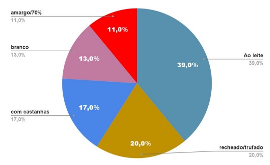 De acordo com os números, o chocolate favorito das massas é o chocolate ao leite (39%), seguido pelo recheado/trufado (20%), com castanhas (17%), chocolate branco (13%) e amargo/70% (11%).
