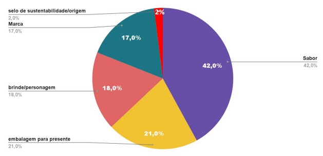 Somado a isso, entre os fatores que mais influenciam na escolha do consumidor na hora da compra estão o sabor (42%), com foco total em qualidade e receitas; embalagem (21%), onde o visual vende o presente; brindes (18%), essencial para o nicho infantil; marca (17%), com fidelidade em queda e abertura a novos players; e por fim, a sustentabilidade (2%), sendo um nicho ainda muito restrito.