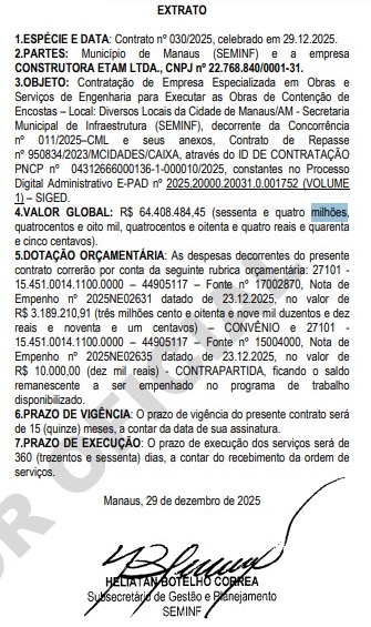 De acordo com o extrato publicado, a contratação foi realizada por meio de concorrência pública e tem como objetivo a execução de obras e serviços de engenharia, para enfrentar problemas recorrentes de erosão e deslizamentos em áreas consideradas de risco na capital amazonense.