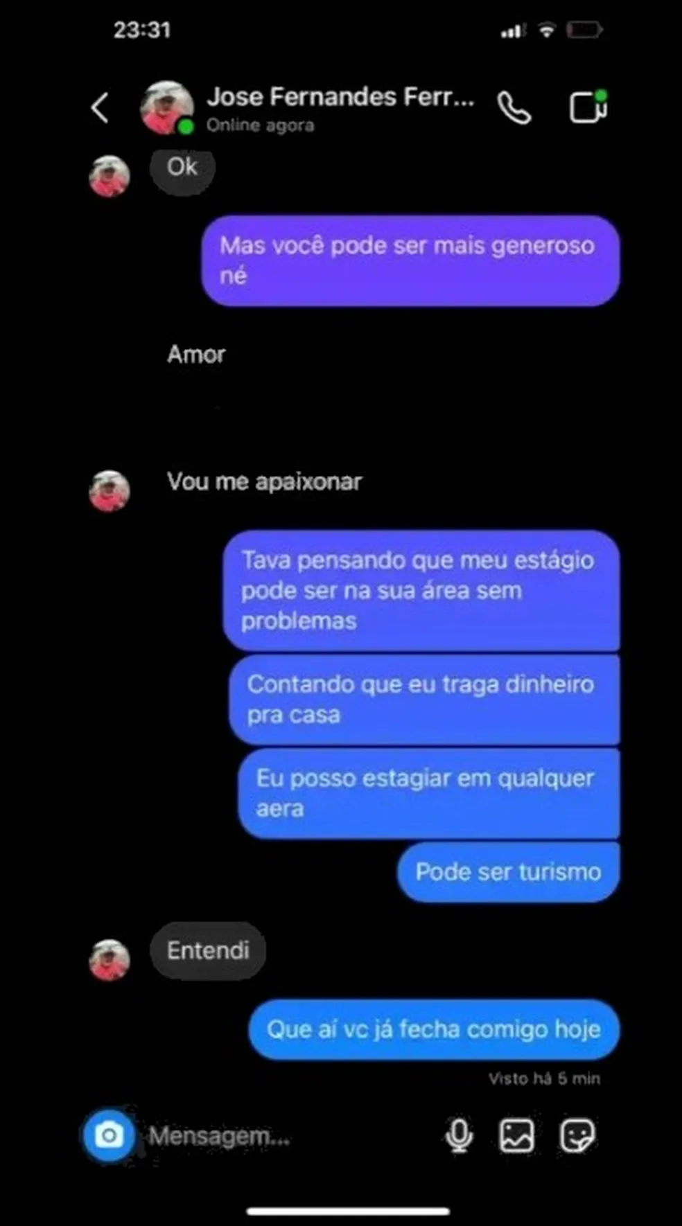 Nas imagens vazadas, Dudé pede para que a universitária envie fotos das partes íntimas. Outras mostram a estudante pedindo que Dudé a ajudasse a conseguir um cargo de estagiária na área de turismo, mas ela deveria dormir com ele em troca.
