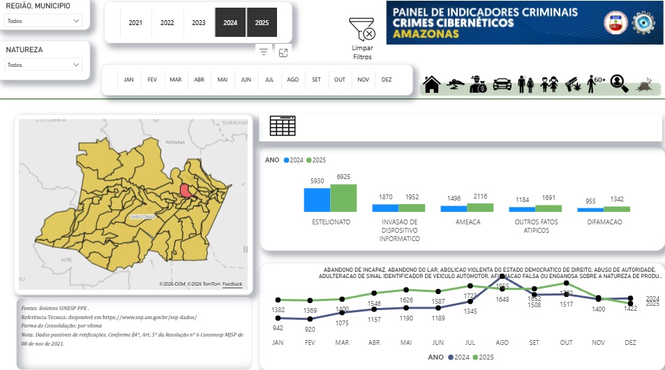 O número de crimes cibernéticos registrados no Amazonas aumentou cerca de 22,7% entre 2024 e 2025, segundo dados do painel de indicadores da Secretaria de Segurança Pública do Amazonas (SSP-AM). Segundo o levantamento, o total de ocorrências passou de 11.435 casos em 2024 para 14.026 em 2025, um acréscimo de 2.591 entre os anos analisados. Entre os delitos estão estelionato, invasão de dispositivo informático, ameaça, difamação e outros fatos atípicos, registrados no ambiente digital.