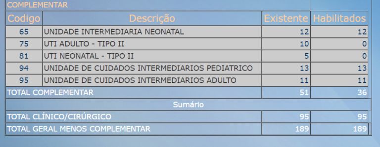 As unidades constam na lista de leitos existentes, apesar de não habilitados. O CNS reúne em sua base de dados os leitos disponíveis nas instituições de saúde nacionais, repassadas pelas gestões municipais e estaduais, como leitos clínicos, cirúrgicos, complementares, adultos e pediátricos, entre outros.