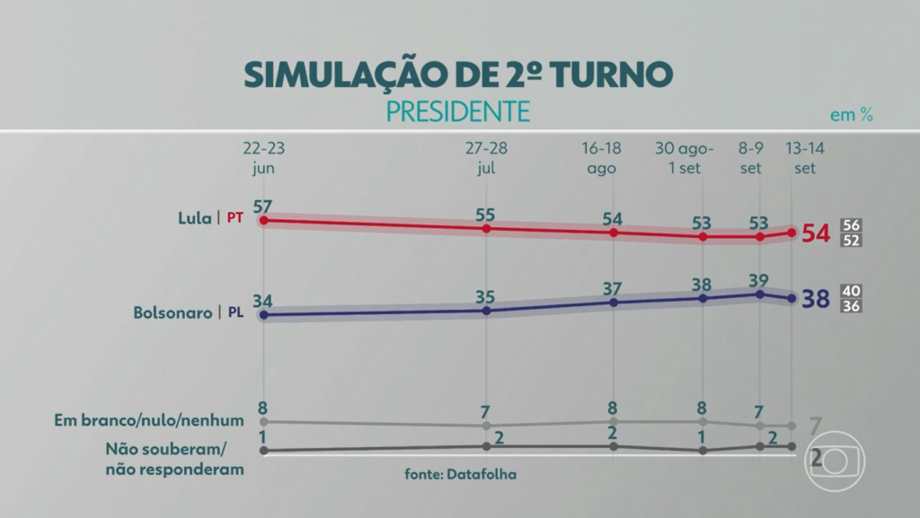 Os números são semelhantes à simulação de segundo turno feita pelo instituto de pesquisas. O levantamento aponta que em um eventual segundo turno, Lula teria 54% das intenções de voto contra 38% do atual presidente. Ambos oscilaram um ponto dentro da margem de erro, Lula positivamente e Bolsonaro negativamente.