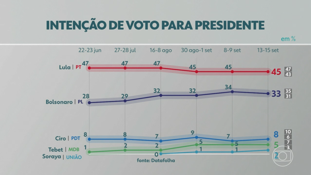 O levantamento divulgado pelo instituto Datafolha nesta quinta-feira (15/9) afirma que o ex-presidente Luiz Inácio Lula da Silva (PT) manteve os 45% de intenções de voto da última pesquisa. Candidato à reeleição, o presidente Jair Bolsonaro (PL) oscilou negativamente de 34% para 33% das intenções de voto, dentro da margem de erro de dois pontos percentuais. Na terceira via, Ciro Gomes (PDT) oscilou positivamente, enquanto as senadoras Simone Tebet (MDB) e Soraya Thronicke (União) entraram em empate técnico.