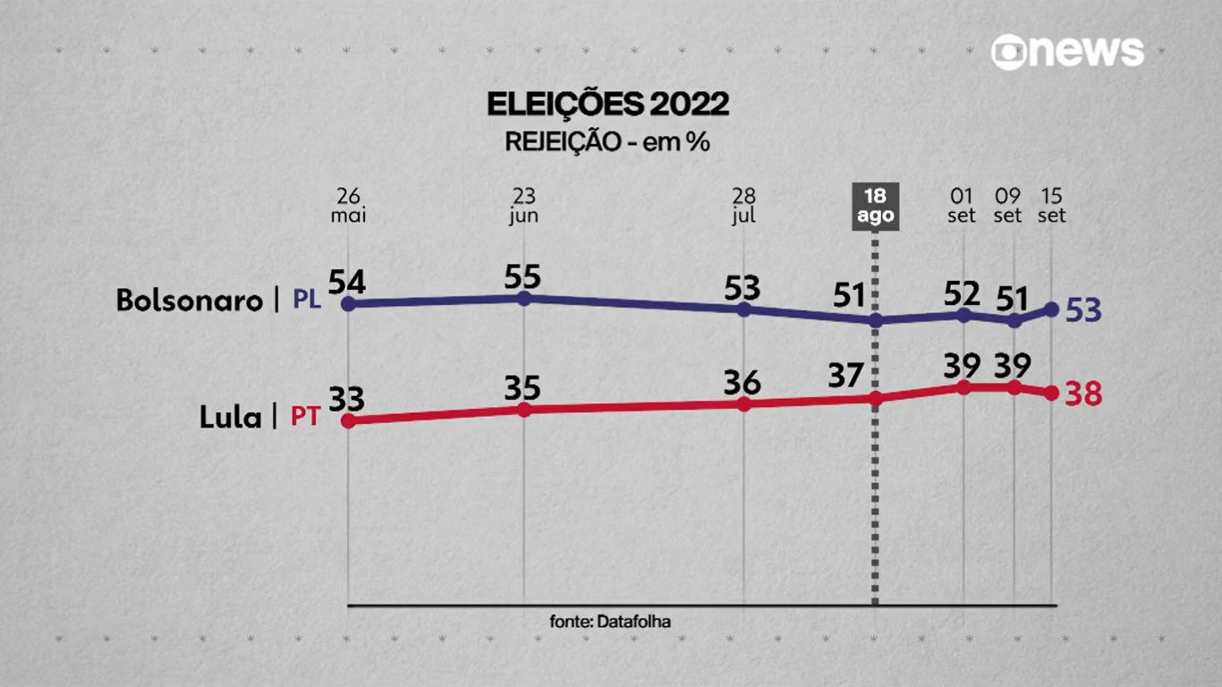 O levantamento divulgado pelo instituto Datafolha nesta quinta-feira (15/9) afirma que o ex-presidente Luiz Inácio Lula da Silva (PT) manteve os 45% de intenções de voto da última pesquisa. Candidato à reeleição, o presidente Jair Bolsonaro (PL) oscilou negativamente de 34% para 33% das intenções de voto, dentro da margem de erro de dois pontos percentuais. Na terceira via, Ciro Gomes (PDT) oscilou positivamente, enquanto as senadoras Simone Tebet (MDB) e Soraya Thronicke (União) entraram em empate técnico.