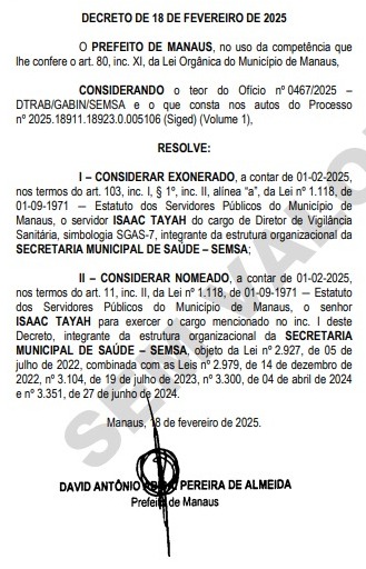 O prefeito de Manaus, David Almeida (Avante), nomeou o ex-vereador Isaac Tayah para assumir o cargo de diretor de Vigilância Sanitária da Secretaria Municipal de Saúde (Semsa). O decreto com a nomeação foi publicado no Diário Oficial do Município (DOM) da terça-feira (18).