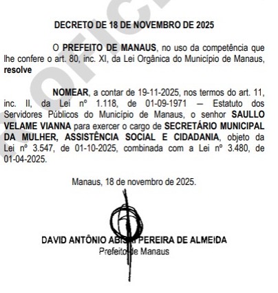 De acordo com o decreto, Saullo Vianna volta ao posto com base no Estatuto dos Servidores Públicos do Município de Manaus e na legislação que estrutura a Semasc. A publicação determina que o secretário retome suas atribuições a partir do dia 19 de novembro de 2025.