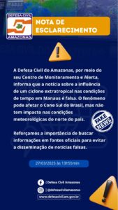 A Defesa Civil do Amazonas, por meio do Centro de Monitoramento e Alerta, informou, nesta quinta-feira (27), que é falsa a notícia que um ciclone extratropical afetaria Manaus. O fenômeno pode atingir a região do Cone Sul do Brasil, mas não terá impacto no clima do Norte do país.