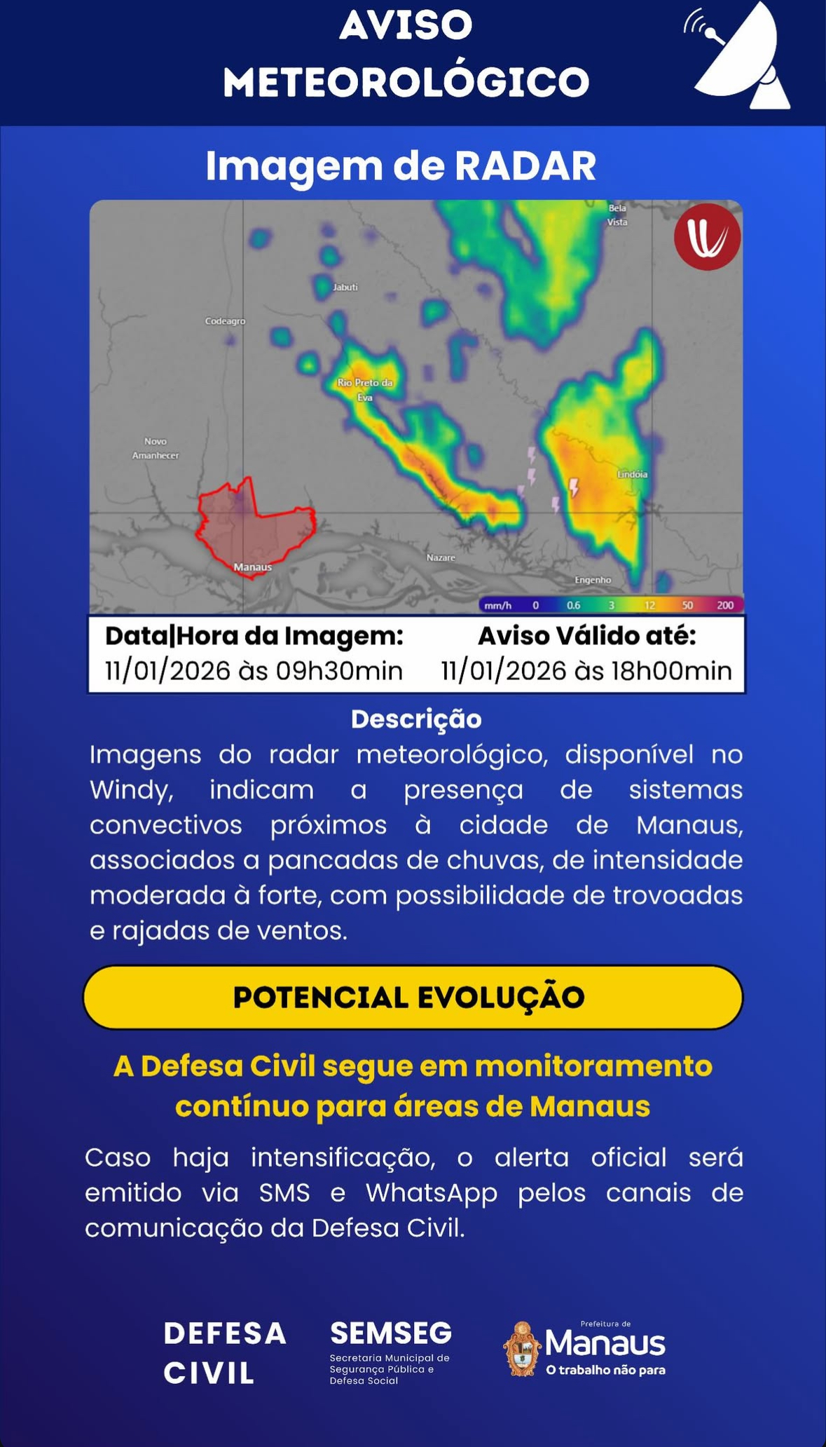 A Defesa Civil de Manaus emitiu, neste domingo, 11, um alerta para chuvas intensas na capital amazonense, com risco de alagamentos e enxurradas. Em caso de emergência, a população pode acionar o órgão pelo telefone 199 ou pelo número 193, do Corpo de Bombeiros.