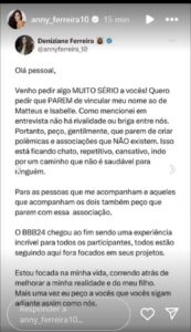 “Quero pedir que parem de vincular meu nome ao de Matteus e Isabelle. Como mencionei em entrevista, não há rivalidade ou briga entre nós. Portanto, peço, gentilmente, que parem de criar polêmicas e associações que não existem,” pediu Deniziane.