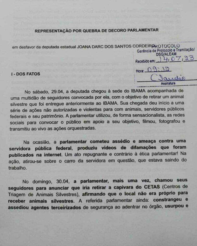 O documento que deve ser enviado à Comissão de Ética da Aleam, Joana teria supostamente cometido “assédio e ameaças contra uma servidora pública federal, produziu vídeos de difamações que foram publicados na Internet”, além de incitar seguidores para irem ao órgão.