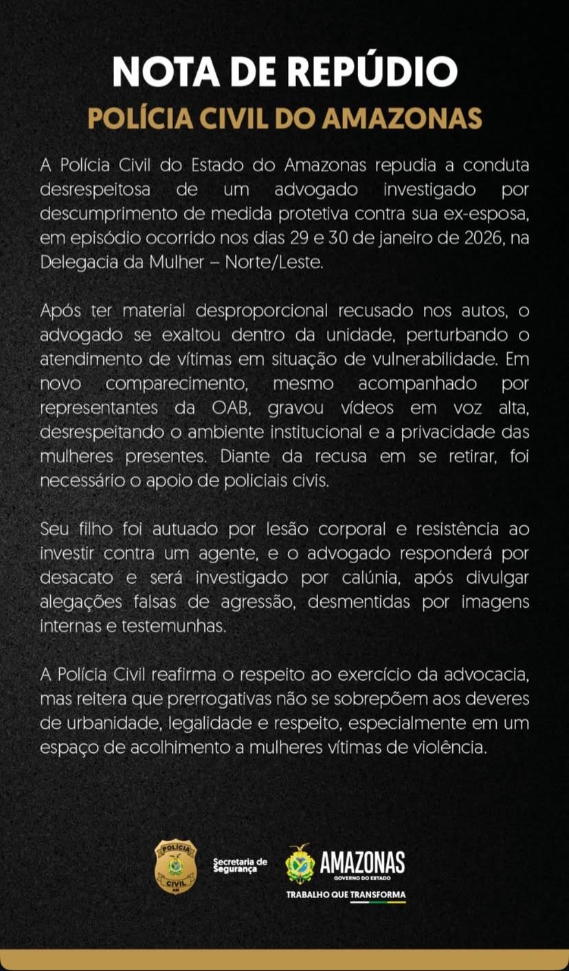 Em nota oficial, a Comissão de Prerrogativas da Ordem dos Advogados do Brasil – Seccional Amazonas (OAB/AM) repudiou veementemente a conduta dos policiais civis, classificando-a como violenta.