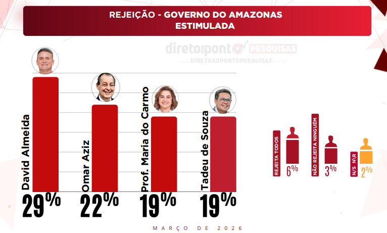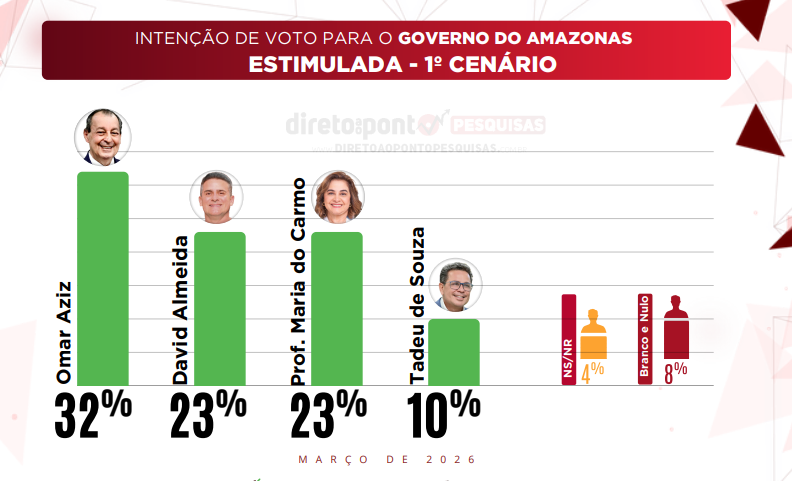 Um levantamento do Direto ao Ponto Pesquisas, realizado entre fevereiro e março de 2026, sobre a disputa pelo Governo do Amazonas, aponta liderança do senador Omar Aziz (PSD), com 32% das intenções de voto no primeiro cenário estimulado. Na segunda colocação aparecem empatados o prefeito de Manaus, David Almeida (Avante), e a professora Maria do Carmo (PL), ambos com 23%. O vice-governador Tadeu de Souza (PP) registra 10%. Outros 4% disseram não saber ou não responder, enquanto 8% afirmaram votar em branco ou nulo.