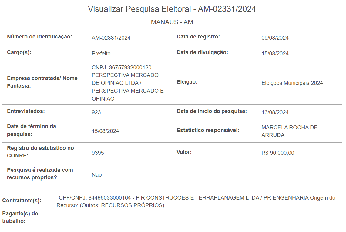 A Perspectiva Mercado e Opinião, instituto de pesquisa de Durango Duarte, declarou ao Tribunal Regional Eleitoral (TRE-AM) que o levantamento de intenções de voto do eleitorado de Manaus custou R$ 90 mil e foi contratada pela empresa PR Construções e Terraplanagem LTDA/PR Engenharia.