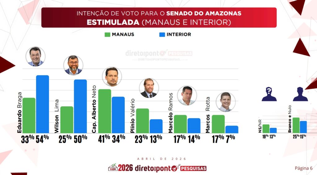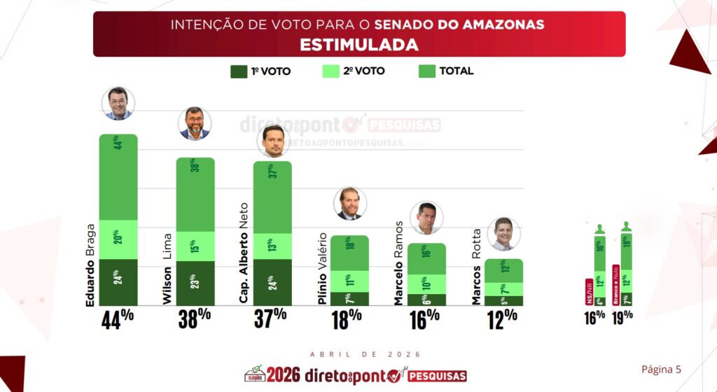A primeira pesquisa de intenção de votos para o Senado em 2026, divulgada pela Direto ao Ponto Pesquisas, nesta terça-feira (29), aponta Eduardo Braga e Wilson Lima como líderes na corrida pelas duas vagas em disputa no Amazonas. Capitão Alberto Neto surge em terceiro lugar em um levantamento que testou seis possíveis candidatos.