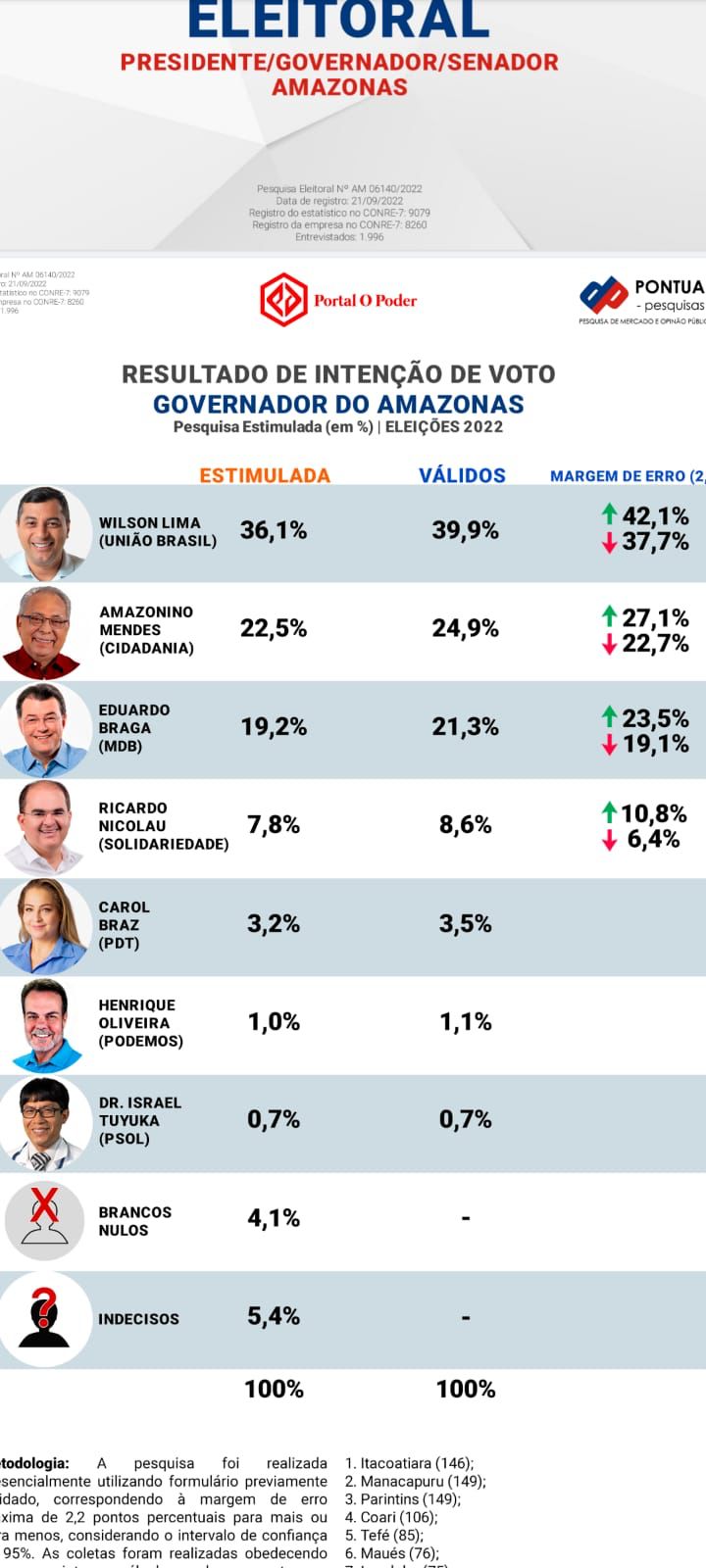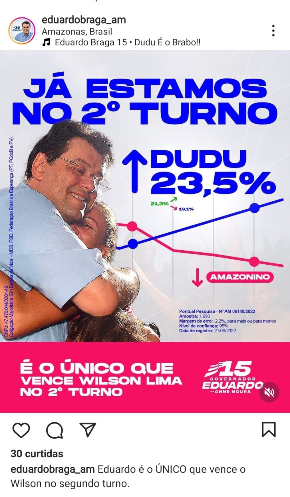O candidato ao governo do Amazonas, Eduardo Braga (MDB), divulgou nesta sexta-feira (30/9) informações erradas usando um levantamento feito pelo Instituto Pontual Pesquisas, alegando que está no segundo turno das eleições, com 23,5% de intenções de voto, próximo de Wilson Lima (União Brasil), que lidera com 39,9% da preferência dos eleitores. O senador publicou nas suas redes sociais uma arte com o número da margem de erro da pesquisa, de 2,2 pontos para mais ou para menos, como se fosse o número principal da pesquisa eleitoral.