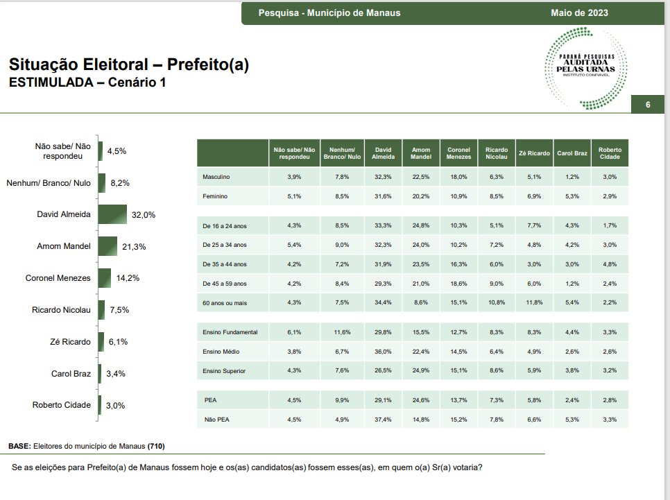 O prefeito de Manaus, David Almeida (Avante), apareceu em primeiro lugar em mais uma pesquisa eleitoral. O levantamento divulgado pelo instituto Paraná Pesquisas mostra o prefeito com 32% das intenções de voto no primeiro cenário, seguido pelo deputado federal Amom Mandel (Cidadania), que possui 21,3%. O terceiro lugar fica a cargo do coronel Alfredo Menezes (PL), com 14,2%.