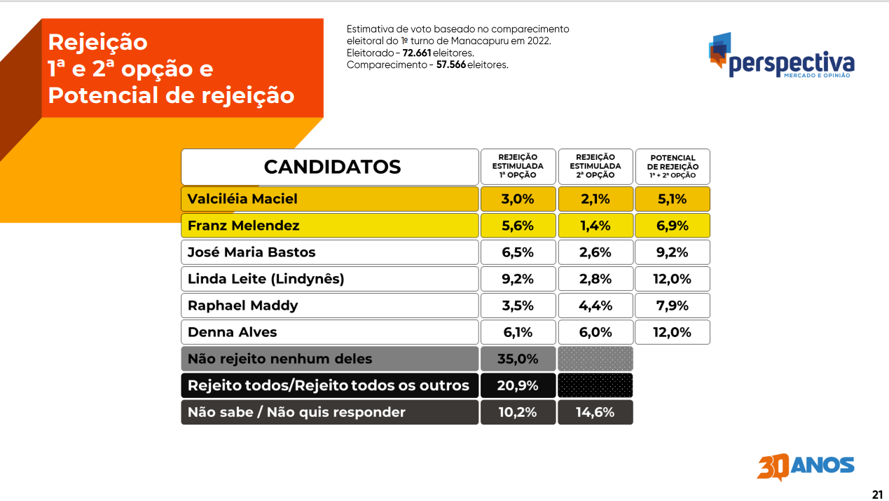 No quesito rejeição, Denna Alves e Lindynês empatam com 12% de potencial de rejeição, seguidos por José Maria Bastos (9,2%), Raphael Maddy (7,9%), Franz Meléndez (6,9%) e Valciléia Maciel (5,1%). Outros 35% dos eleitores afirmaram não rejeitar nenhum candidato, enquanto 20,9% rejeita todos.