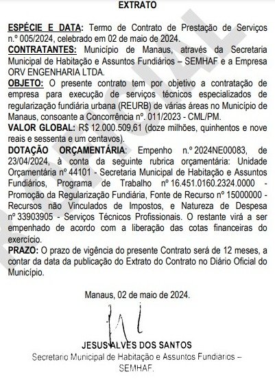 O Termo de Contrato de Prestação de Serviços nº. 005/2024, foi celebrado no dia 2 de maio de 2024, e tem como objeto a contratação da empresa para execução de serviços técnicos especializados de regularização fundiária urbana (REURB) de várias áreas no município de Manaus.