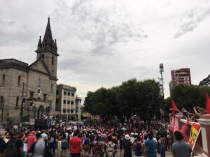 Manifestantes se reúnem em frente à Igreja São Sebastião em ato contra o presidente Jair Bolsonaro – Foto: Portal Dia a Dia Notícias
