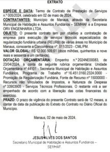 A Secretaria Municipal de Habitação e Regularização Fundiária (SEMHAF) contratou a empresa ORV Engenharia Ltda. para a execução de serviços especializados em regularização fundiária urbana. O contrato, no valor de R$ 12 milhões, foi publicado no Diário Oficial do Município (DOM) nº 5818, Caderno 1/2, na edição de 03 de maio de 2024, na página 34.