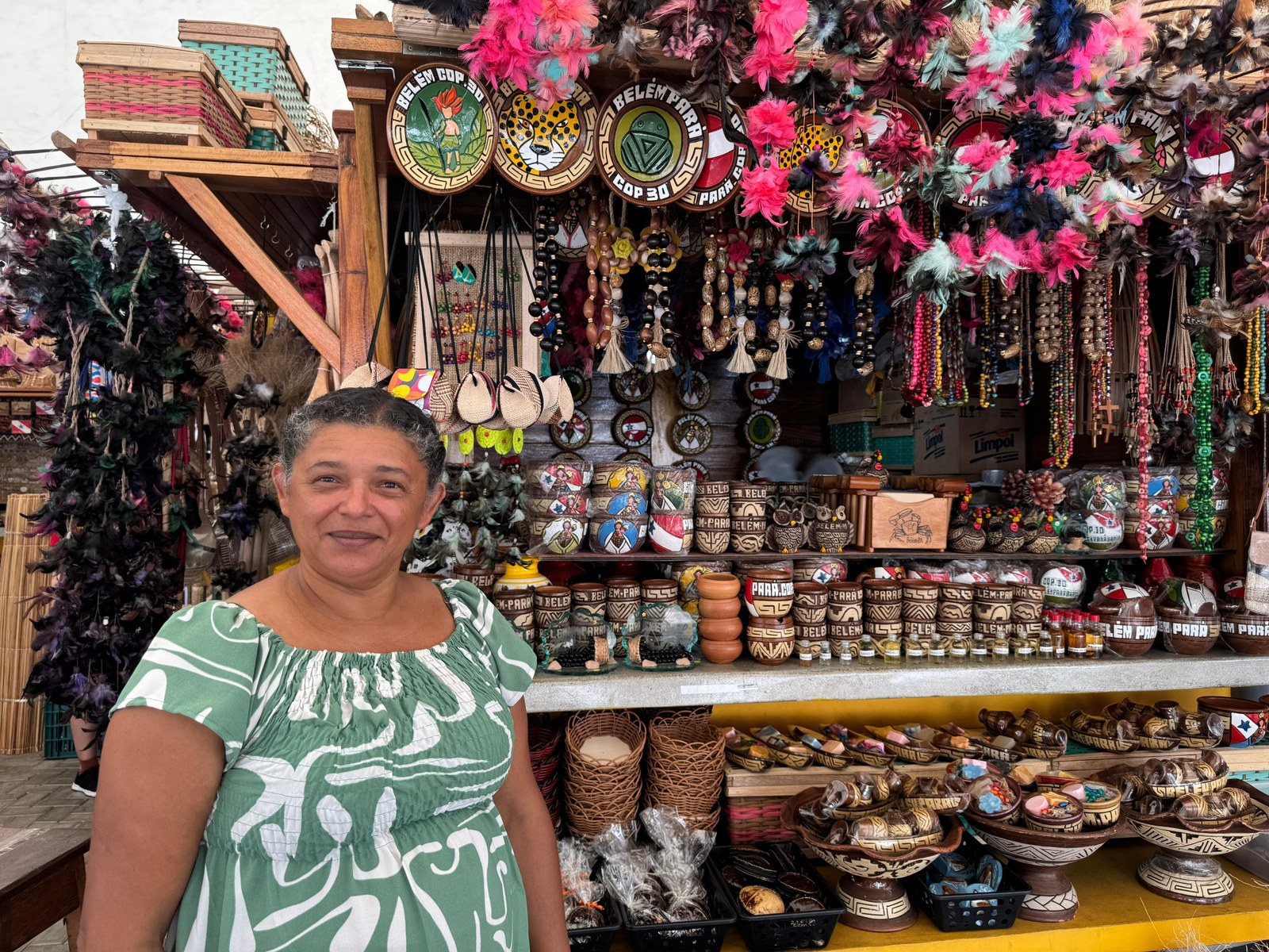 Os souvenirs de Nossa Senhora de Nazaré encantam a área de artesanato do Ver-o-Peso, a maior feira a céu aberto da América Latina. E, agora, há espaço para canecas com a logo da COP30, camisetas e pratos de cerâmicas pintados artesanalmente. Com escritas da COP30 e de Belém, as imagens variam entre o Curupira, a onça, a bandeira do Pará e também o muiraquitã, amuleto em forma de sapo verde, considerado símbolo de sorte pelos povos amazônicos.