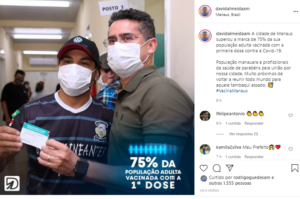 “A cidade de Manaus superou a marca de 75% da sua população adulta vacinada com a primeira dose contra a Covid-19. População manauara e profissionais da saúde de parabéns pela união por nossa cidade. Muito próximos de voltar a reunir todo mundo para aquele tambaqui assado”, escreveu David Almeida.