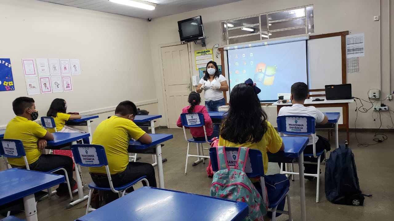 Os pais, responsáveis e estudantes do ensino fundamental da Escola Estadual de Tempo Integral (Eeti) Santa Terezinha, na zona do centro-sul de Manaus, tiveram, na quarta-feira, dia 30, acesso a vídeos e orientações sobre como os protocolos de segurança em saúde devem ser aplicados, dentro e fora das salas de aula. A escola atende 150 crianças, do 1º ao 5º ano do Ensino Fundamental, e foi uma das 107 unidades escolares que retomaram as atividades presenciais, nesta semana.