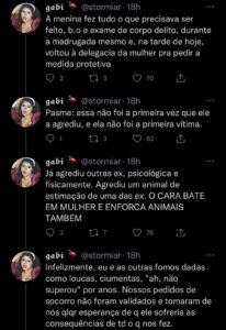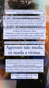 Em outro momento, Gabriele conta que chegou a fazer Boletim de Ocorrência contra Maike, mas que foi taxada como louca. “Infelizmente, eu e as outras fomos dadas como loucas e ciumentas. Nossos pedidos de socorro não foram validados e tomaram de nós qualquer esperança de que ele sofreria as consequências de tudo que nos fez”, relatou.