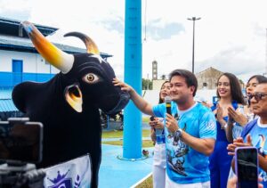 A bandeira do boi Caprichoso tremula no céu azulado de Parintins, anunciando que o bumbá está preparado para a temporada 2022. O momento que aconteceu na manhã deste sábado (19/03) foi marcado pela emoção ao som de toadas inesquecíveis do boi da estrela na testa. Itens oficiais, marujada de guerra, diretoria e torcedores tradicionais azulados se reencontraram. Os abraços voltaram a acontecer, o dois pra lá, dois pra cá presencial voltou a ser realidade e a toada de boi-bumbá por mais animada que fosse, fez as lágrimas molharem os rostos de apaixonados torcedores.