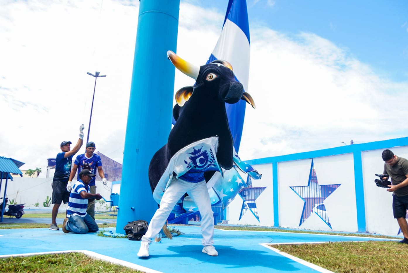 Enquanto os torcedores brincavam de boi-bumbá, os artistas Osvaldo Fonseca (Toné), Cristiano Pereira (Sete), Silvio Nogueira (Moreno) e Eduardo Lima (Boca) usavam da força nos braços para puxar o cabo de aço que segura o pavilhão azul e colocá-lo no alto do mastro. Como se estivessem cuidando dos movimentos alegóricos todos estavam orgulhosos da missão que anuncia que o Boi Negro de Parintins está preparado para o título do 55º Festival Folclórico. “Erguer o pavilhão do Caprichoso é erguer a história de uma vida. É o orgulho de ser azul e branco”, destacou Boca.