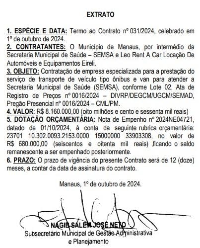 De acordo com o extrato, a empresa foi contratada novamente pela Semsa pelo valor de R$ 8.160.000,00 (oito milhões e cento e sessenta mil reais), para serviço de transporte de veículo tipo ônibus e van para atender a pasta. O contrato nº 031/2024, celebrado no dia 1º de outubro de 2024, terá duração de 12 meses.