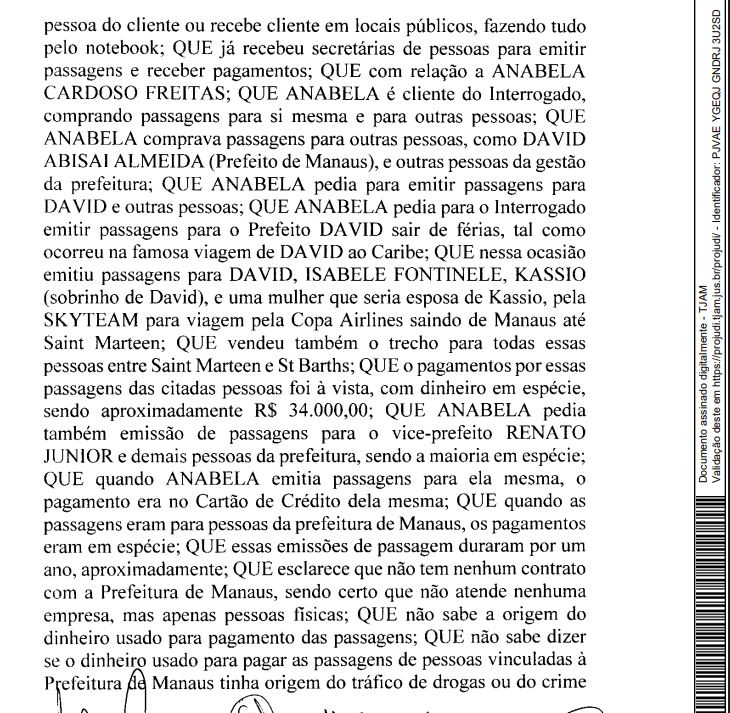 No depoimento, o empresário também citou o nome do ex-subsecretário de Obras, Valcerlan Ferreira Cruz, que atuou como ordenador de despesas da Secretaria Municipal de Infraestrutura (Seminf). Alcir Queiroga também declarou que Anabela Cardoso Freitas, presa na sexta-feira, 20, comprava passagens aéreas para parentes dos citados que, segundo ele, “orbitavam no entorno dessas pessoas”. O empresário afirmou ainda que a assessora pagava com cartão de crédito quando as passagens eram destinadas a ela própria, mas efetuava pagamentos em notas de R$ 100 e R$ 50,“sendo que, às vezes, havia notas de R$ 20”, quando os bilhetes eram para o prefeito de Manaus, David Almeida, e pessoas de sua confiança.