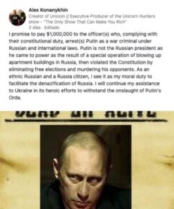 O empresário russo Alex Konanykhin ofereceu um prêmio de US$ 1 milhão para quem conseguir capturar Vladimir Putin. A oferta foi feita em suas redes sociais e, no LinkedIn, veio acompanhada de uma imagem do rosto do presidente da Rússia com a frase “Procurado: vivo ou morto, por assassinato em massa”.