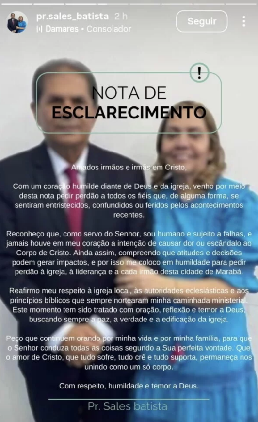 O episódio já havia provocado grande repercussão no ano de 2025, quando Sales Batista quebrou o silêncio e se manifestou publicamente depois de ser afastado da presidência da Assembleia de Deus Missão em Marabá e da vice-presidência da Convenção Estadual das Assembleias de Deus no Pará (Comieadepa).