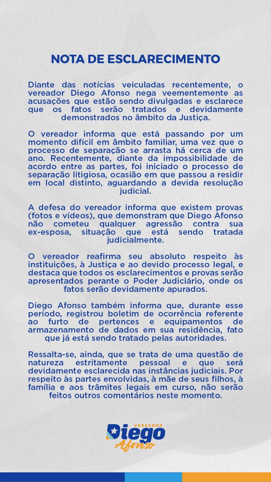 Em nota, o vereador Diego Afonso afirmou que nega as acusações e declarou que os fatos serão esclarecidos no âmbito da Justiça.